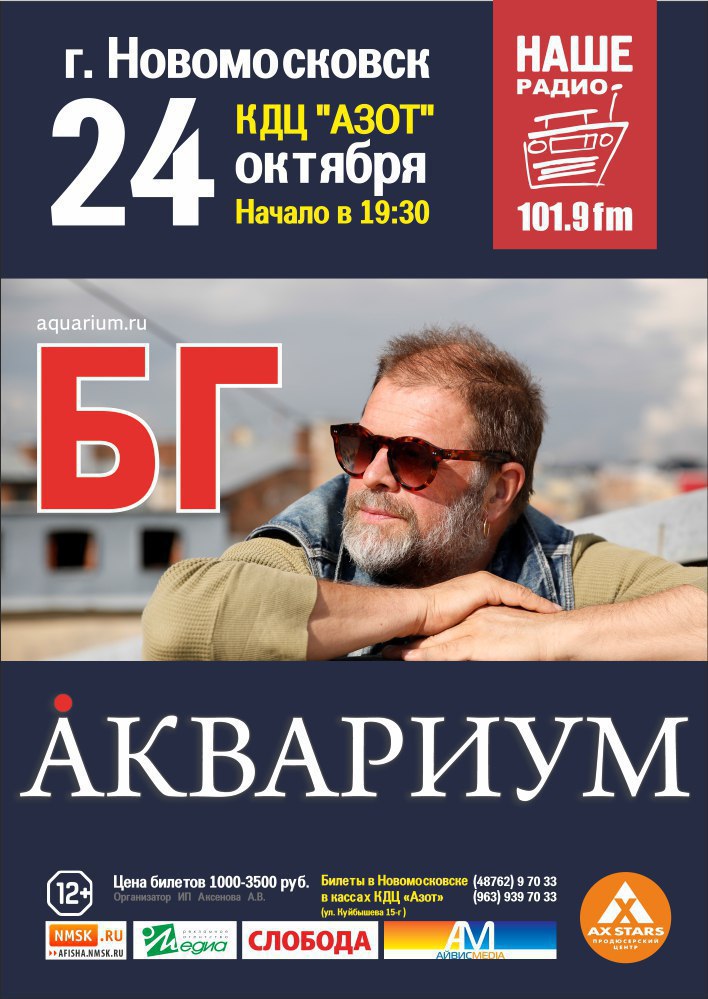 Призы и подарки:Пригласительные билеты на концерт группы «Аквариум», который состоится 24 октября в КДЦ «Азот» г. Новомосковск. Начало в 19.30.